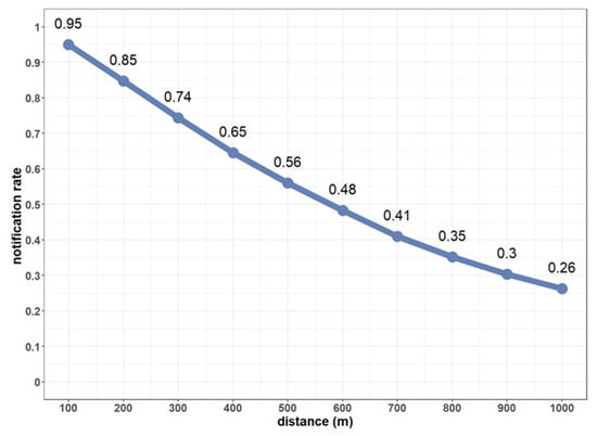 To ascertain the rate of notifications for information about sex offenders residing nearby, we calculate the average rate of sex offenders residing in the area whose information is distributed. As shown in Figure 9, by expanding the distance in 100 m increments from 100 m to 1 km based on the center of each children and youth grid, the average rate of notifications for information about sex offenders based on a 500 m distance is approximately 0.56. This implies that, for example, if there are four sex offenders residing within 500 m of children and youth, approximately half of them (two people) will not have their information distributed.