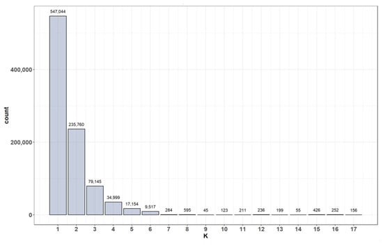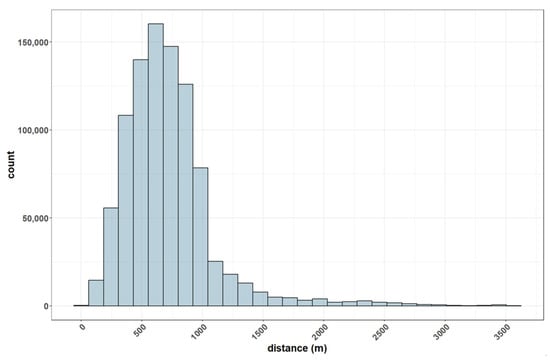 To ascertain how close child- and youth-care households are to sex offenders whose information has not been distributed, the distance to the nearest offender residing in another administrative district was calculated based on the center of each grid and displayed as a distribution. The analysis revealed approximately 255,000 children and youth households within 500 m of sex offenders whose information has not been distributed, as shown in Figure 10. This implies that approximately 28% of child- and youth-care households are not notified about sex offenders residing within 500 m.