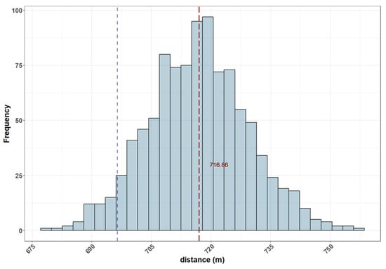Similarly, the residences of sex offenders were randomly generated, and the distance from sex offenders whose information was not distributed was calculated 999 times, like the section “Vulnerability Statistics 2”. The simulation results show that the average distance from such a sex offender is a minimum of 678 m and a maximum of 756 m for random sex offender residences (Figure 13). The average distance from such sex offenders in this study was 716.86 m. The actual residence-based analysis results fall within the 95% confidence interval (blue dash line in Figure 13) of the randomly generated residence-based analysis results. It was confirmed that even in random residence types, child- and youth-care households are similarly close to such sex offenders. This implies that the problem of distributing sex offender information is not a coincidence of residence at a particular point in time. Rather, it is a fundamental limitation of the administrative-district-based system. Therefore, these problems cannot be avoided at any residence.