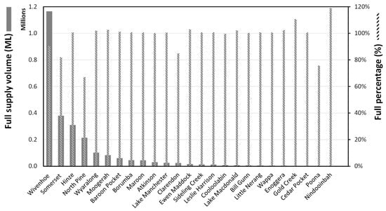 Wivenhoe Dam (Figure 1), the largest in southeast Queensland, has a full supply capacity of 1.165 million megalitres (constituting 45.3% of Queensland’s water, Figure 2) and a flood mitigation capacity of 1.967 million megalitres. The dam is located upstream of the Brisbane River (80 km from Brisbane City) with a wall length of 2300 m. Wivenhoe Dam is an earth and rock embankment with a concrete spillway contains five massive steel gates 12.0 m in width and 16.6 m in height [15]. During intense local rain, the dam’s five steel gates open to release excess water, maintaining a controllable reservoir level. The dam primarily serves to supply essential water to Brisbane and the surrounding areas (see Figure 3) and plays a crucial role in flood mitigation and power generation.