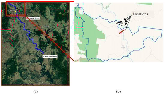 The upper Brisbane catchment (Figure 5) is located to the north of Brisbane City and form around 40% of Brisbane River catchments with an estimated area of around 5493 km2. It functions as the primary area of runoff for Brisbane’s water supply to Wivenhoe Lake [28]. The upper Brisbane catchment contains 12 sub-catchments that can be seen in Figure 5b. The main water channels that feed in the proposed dam at Linville include the upper Brisbane River, Monsildale Creek, and Cooyar Creek sub-catchments (see Figure 5b). As each location has different characteristics, the water flow will be different [29].