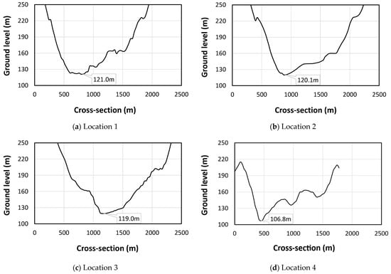 Dam wall size can be used for the optimal selection of the new supplementary dam wall location. Thus, QGIS was relied upon to extract the topographical cross-section of the proposed dam walls at both Potential Points 1 and 2. Figure 8 shows the cross-section of the proposed dam wall Locations 1 to 4 for further optimising the selection of the best option. The cross-section at Potential Point 1 (including Locations 1 to 3, see Figure 8a–c) appears to have similar properties with no significant difference in the topographical features. In contrast, at Potential Point 2, the topography is not uniform, indicating that preconstruction preparations should be taken place to build a safe and quality dam wall. Additionally, it can be observed that the maximum dam wall height in Location 4 (Figure 8d) is around 103 m (this maximum height is normally applied to reduction factors to obtain road facilities and avoid any over-flooding risks). At Potential Locations 1 to 3, it can be noticed that the topography extends up to 150 m (with a ground level of 120 m and first spillway at 270 m) which allows for the flexibility to construct a mega dam wall. Building a dam wall of 150 m leads to having the biggest dam in Australia in terms of collected watershed volume and the second tallest dam wall after Talbingo Dam in New South Wales. Excluding Location 4 as an option is further supported by the higher construction cost of the dam wall in Location 4 (at least 93.6 m in height) compared to Locations 1 to 3 (80 m in height) (see Table 1 and Figure 8) for the same catchment elevation. Therefore, Potential Location 2 is suggested to be excluded from further analysis.