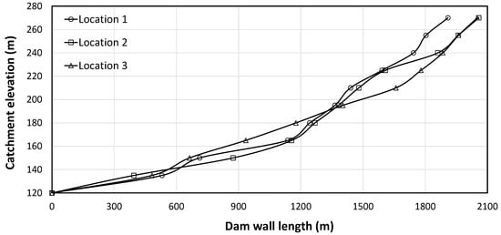 At Potential Point 1, the streamlines (Locations 1 to 3 as seen in Figure 8a–c) appear similar; thus, the dam wall width will be the critical factor to determine the optimal selection. In Figure 9, the dam wall width was plotted against the catchment elevation for all possible dam wall options. It can be observed that the dam wall width of Location 3 is the smallest until a catchment elevation of 195 m, according to the topography. This catchment elevation indicates a wall height of 75 m which is higher than the Wivenhoe Dam wall (59 m). Thus, this option will be optimal if the target dam wall height mimics Wivenhoe Dam (which will be narrower than the other options). On the other hand, Location 1 will be optimal if the maximum wall height is considered (150 m), targeting the maximum watershed volume. This means that Location 2 can be excluded in both scenarios. However, more supporting statements need to be claimed and discussed in the next section to select the optimal option.