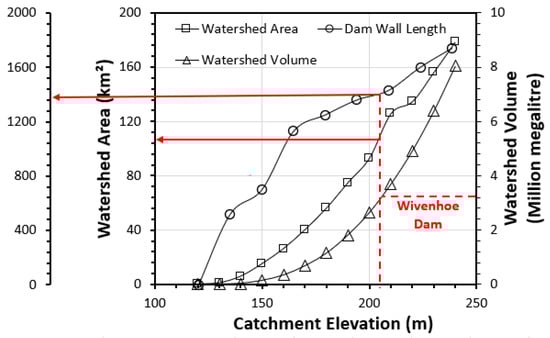 For optimising the dam wall dimensions, several options were suggested by this study considering the watershed volume, dam side area, and cost of the dam wall construction comparing to Wivenhoe Dam as one of the largest dams in Queensland, Australia. For a more realistic comparison between Wivenhoe Dam and the proposed dam, Figure 10 shows the relationship between the dam wall height with the relative watershed area and volume as well as the dam wall length of the proposed dam.