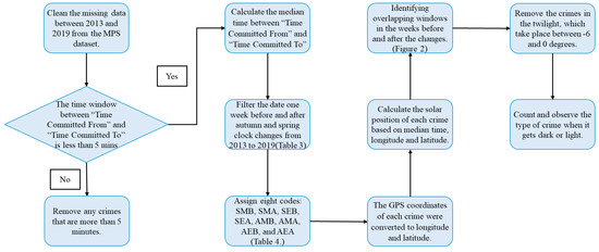 Flow chart of the study. Missing data refers to the lack of or incorrect information in the dataset. For example, the time committed column was empty or the type of crime was written in the time column. GPS coordinates refer to the British National Grid reference numbers.