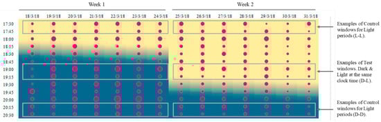The twilight period can cause ambiguity in classifying dark and light conditions because the twilight period is variable, and it can still be daylight during this period. Illuminance over the twilight period was explored using a dataset consisting of over 1,600,000 records of illuminance made at 5 min intervals over 2 years in eight locations across the UK in previous research. All illuminance records were binned according to solar altitude. Analysis of illuminance percentiles revealed an illuminance of 10 lux at the 99th percentile at a solar altitude of −6 degrees and an illuminance of 50 lux at the first percentile at 0 degrees. This means that we can say with some certainty that it is dark at −6 degrees and light at 0 degrees. Local authorities tend to pick 30 lux as the threshold at which to turn street lighting on, so 50 lux is a safe estimate for conditions deemed daylit enough for street lighting not to be required. At −5 degrees, the 99th percentile value was 40 lux, and at 1 degree the first percentile value was 80 lux; these illuminance values do not provide enough certainty of darkness and daylight, which is why solar altitudes of −6 degrees and 0 degrees were used to define darkness and daylight [31]. Therefore, this study removed crimes which took place between −6 degrees and 0 degrees, which amounted to 7592 crimes in the weeks of interest. Crimes in the twilight period were added back into the dataset when the study reported crimes by the hour. Figure 2 gives an example (spring 2018) of the effect of the clock change, in this case from GMT (Greenwich Mean Time) to BST (British Summer Time), on daylight availability.