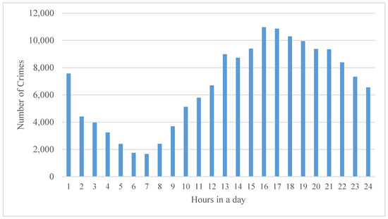 The study also reports the distribution of crime rates in London by each hour throughout the day. Figure 4 presents 158,933 recorded crimes where the time of the crime was known to 5 min or less, within 1 week before and after autumn and spring clock changes for all years. Figure 4, therefore, only represents 45.4% of crimes reported in the week of interest. All types of crimes mentioned above are included in Figure 4. Number 1 shows the crime counts between midnight and 1 am. The results demonstrate that crime is lowest around 6 am, whereas crime rates increase significantly in the afternoon, and incidents of crime peak between 3 pm and 5 pm. A total of 30.65% of crime occurs in the morning, and 69.35% of crime occurs in the afternoon.