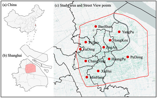 Study area. (a) Map of China; (b) map of Shanghai; (c) study area and Street View points.