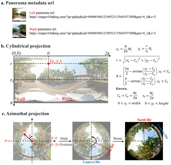 Using BSV panorama for azimuth fisheye view. (a) An example of a panorama metadata url, (b) a cylindrical BSV panorama, (c) the generated fisheye image based on the geometrical transform model, adjusted to generate the correct-orientation fisheye image.
