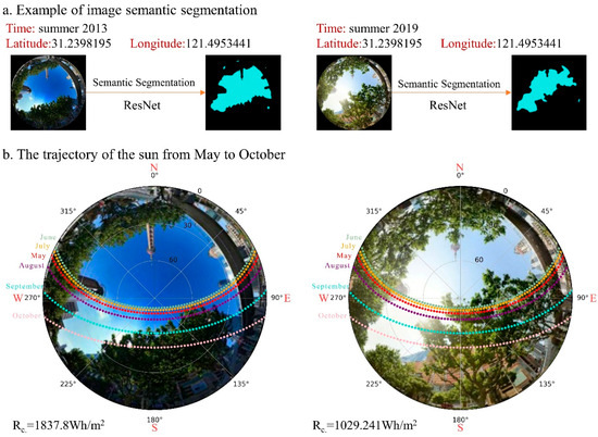 Using Pysolar, the position of the sun can be precisely calculated based on geographical coordinates and time. As the sun changes position over the course of a day, its movement trajectory can be overlaid with a fisheye diagram to measure the duration of solar radiation. Figure 3b displays the sun’s movement trajectory for 2013 and 2019. The time frame is from May to October, on the 15th of each month. The movement trajectory is recorded every 10 min. If the sun is not in the sky area of the fisheye diagram, sunlight will be obstructed by plants and buildings. Our study is based on ideal conditions of clear weather without cloud cover, although there is a discrepancy with actual weather conditions. Nevertheless, this method of measuring solar radiation can provide scientific guidance for urban planning.
