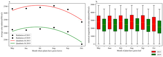 Figure 4 displays the changing trends of solar radiation in different years. In Figure 4a, we have plotted the curve fitting the changing trends of solar radiation for two years. The R2 value for 2013 is 0.8593, and the R2 value for 2019 is 0.8642. These values indicate that our curve has a high degree of accuracy when fitting solar radiation. We have used the calculated data to draw box plots of radiation levels for each month in the two years in Figure 4b. It can be observed that the overall solar radiation in 2019 is lower than in 2013. From May to October, the average solar radiation in 2013 gradually increases, reaches a peak, and then starts to decrease. Similarly, the average solar radiation in 2019 also exhibits a similar trend, but at a lower overall level.