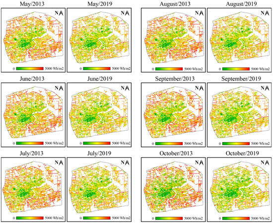 Spatial distribution of solar radiation during May to October in summer 2013 and 2019.