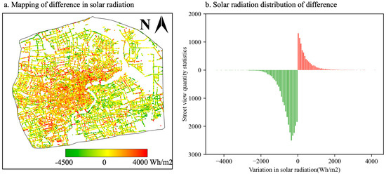 We calculated the solar radiation in the urban space for both years and then calculated the difference in solar radiation at each street view collection point. In Figure 6a, we analyse the change data of solar radiation during the geographical visualisation process. The results show that the closer one is to the urban outskirts, the more likely it is that solar radiation will decrease. However, in the city centre areas, there may even be cases where solar radiation increases.
