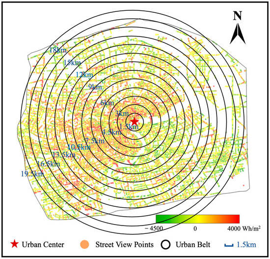 What of the spatial distribution of solar radiation in Shanghai? Inspired by the results of the solar radiation difference, we became interested in the change pattern of radiation intensity from the inner to the outer city. Is the reduction in solar radiation greater in the inner city or the outer city? Taking our selected research area as an example, we used the geometric centre of all the street view collection points as the centre of the circles and drew 13 concentric circles with a 1.5-km interval. The innermost circle has a radius of 1.5 km, and the radius of each subsequent circle increases by 1.5 km. We aggregated and averaged the solar radiation difference scores within the concentric circles to discover the spatial changes in solar radiation within the inner and outer city. In Figure 7, we draw a demonstration diagram. This demonstration diagram can cover most of the city’s street view collection points.