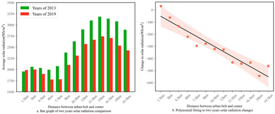 In Figure 8a, we can compare the mean solar radiation of each ring. Overall, except for the innermost 1.5 km, the mean solar radiation in the remaining rings in 2019 is lower than that in 2013. This indicates that the decrease in urban solar radiation has a linear consistency in both the inner and outer urban spaces. This reflects the city’s construction strategy during these six years, with the greening and shading effect being stronger in rings closer to the outer city. This also reflects the city’s historical development process as a highly modernised inner city, currently undergoing an expansion phase from the central area outwards.