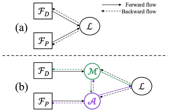 Recently, there have been some successful attempts [,,] to execute monocular depth estimation and visual odometry prediction together in a self-supervised manner by giving full consideration of the transformation between consecutive frames. In this pipeline, two networks are generally used to predict the depth and camera pose separately, which are then jointly exploited to warp source frames to the target ones, converting the depth estimation problem to a reprojection error minimization process, as shown in Figure 1a.