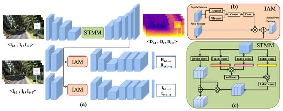 The pose network takes two consecutive frames as input at each time and outputs the corresponding pose transformation based on an encoder–decoder structure as well. To generate more accurate estimations, the network is divided into two branches to calculate R and t, respectively. In the feature encoding phase, the IAM is employed to produce the attention from depth features as guidance for the R and t branches.