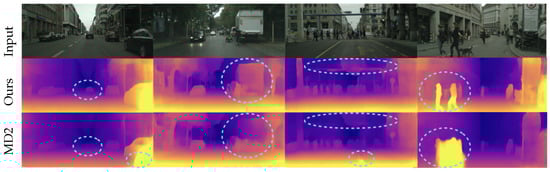 Visual results evaluated on the Cityscapes dataset. The evaluation uses models trained on KITTI without any refinement. Compared with the methods in [], our method generates higher-quality depth maps and captures moving and slim objects better. The difference is highlighted with the dashed circles.