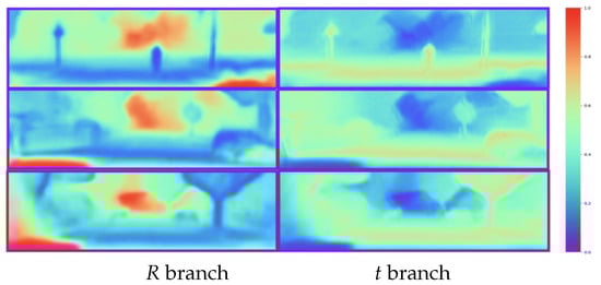 As mentioned before, when predicting the pose from two consecutive frames, we believe that different geometry information has a different impact on the estimation of rotation and translation. Thus, we introduce valuable attention guidance learned by the IAM into the prediction of R and t. The attention maps learned for the two branches during training are visualized in Figure 5, with color variation denoting different weight values. The attention maps indicate that the two branches did learn different geometric priorities from the depth information to help with their own estimation and conversely improve the depth estimation result, as shown in Table 3. The learned geometric patterns demonstrate that the estimation of R attaches more importance to farther regions and corner places, while the t branch values closer areas more. Our IAM adopts an attention mechanism and works in a generalized representation learning manner to utilize the geometric correlation between depth and pose, which can also be useful in other similar tasks to improve estimation quality.
