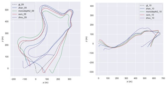 Trajectory estimation is also very important for environment perception [,]. Since the accuracies of the pose and depth estimations are correlated, our proposed method not only produces a high-quality depth estimation but also improves the accuracy of the pose estimation. We used the 00-08 sequences of the KITTI odometry split for training and the 09-10 sequences for the evaluation, as in []. We compared the absolute trajectory errors calculated in overlapping five-frame and three-frame snippets with various methods. In Table 9, our results are clearly superior to the latest self-supervised monocular training methods and also close to the traditional ORB-SLAM method with the loop closure step. The estimated trajectories by our models and other methods are shown in Figure 6 for comparison purposes.