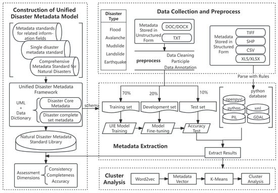 This paper builds a unified metadata standard framework suitable for natural disasters based on the metadata standard of the survey. According to the framework, for metadata stored in structured formats, different Python libraries are used to parse the corresponding data format and extract relevant metadata within the framework. For metadata stored in unstructured formats, UIE is utilized to extract the required information and the parameters are adjusted based on the loss curves and F1 scores to achieve optimal extraction results. Subsequently, the extracted optimal results are stored in the database, and corresponding constraint rules are established for evaluation from three aspects: consistency, completeness, and accuracy. Finally, the Word2vec-Kmeans clustering algorithm is used to analyze the extraction results, which improves the efficiency and accuracy of retrieval and recommendation by classifying the text into different groups. The technical route of this study is shown in Figure 1.