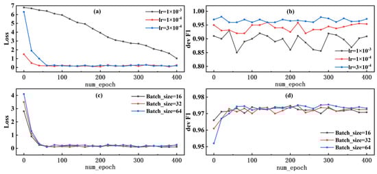 Training losses and F1 scores with different learning rates and batch sizes on the development set. (a) Training losses with lr ranges 1 × 10−3,1 × 10−4 to 3 × 10−4; (b) F1 scores with lr ranges 1 × 10−3,1 × 10−4 to 3 × 10−4; (c) training losses with batch_size ranges of 16, 32, and 64; (d) F1 scores with batch_size ranges of 16, 32, and 64.
