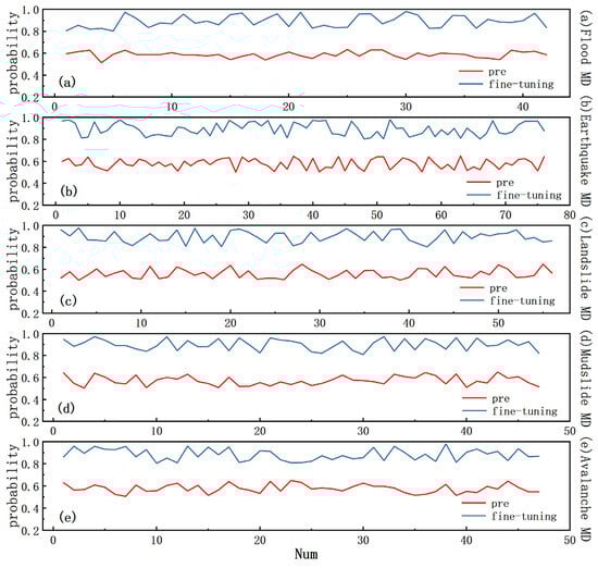 From Figure 5, it can be observed that before model optimization, the probability values of UIE for dataset metadata extraction of five types of disasters—floods, earthquakes, landslides, mudslide, and avalanches—ranged between 0.50 and 0.60. Specifically, the average probability value (ave_pro) for flood domain metadata was 0.59, for earthquake domain metadata ave_pro was 0.58, for landslide domain metadata ave_pro was 0.56, for landslides domain metadata ave_pro was 0.57, and for avalanche domain metadata ave_pro was 0.58. After model optimization, the probability values ranged between 0.80 and 1.00. Specifically, the average probability value after optimization (t_ave_pro) for flood domain metadata was 0.89, for earthquake domain metadata t_ave_pro was 0.89, for landslide domain metadata t_ave_pro was 0.90, for landslide domain metadata t_ave_pro was 0.90, and for avalanche domain metadata t_ave_pro was 0.88. The extraction performance improved by 53.16%, 54.46%, 60.25%, 57.36%, and 53.22%, respectively, all exceeding 50%. It can be seen that the model performed best in extracting flood data before tuning, but the improvement in extracting flood metadata was relatively minima after tuning. Model tuning may have resulted in a more balanced handling of different categories of data, reducing over-reliance on flood metadata. So, the improvement in extracting flood metadata was relatively small. As a result, the experiments indicate that the model showed superior performance in extracting metadata for the five types of disasters, which makes it more suitable for extracting metadata information in the field of natural disasters after training and parameter optimization.