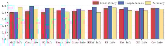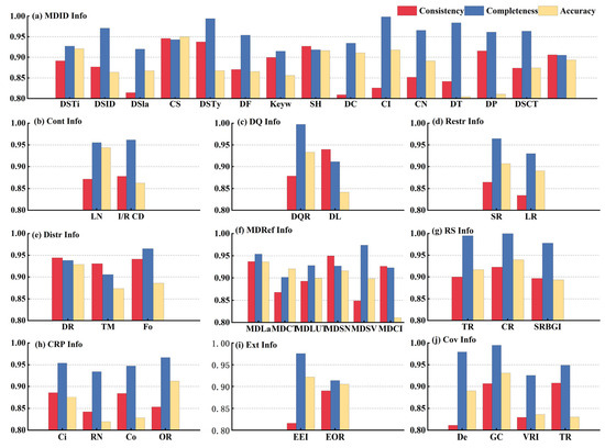 Based on the extraction results, Figure 7 provides an evaluation of the data items in the data tables, focusing on consistency, completeness, and accuracy. The results were all above 0.80 and the results for the completeness assessment of data items in each table were higher than those for consistency and accuracy. Among them, the mean consistency of all data item metadata was 0.89, the mean completeness was 0.95, and the mean accuracy was 0.89. The overall trend of the results is consistent with that of the table level. The maximum value for consistency in the evaluation results was the “metadata standard name” item (MDSN = 0.95) in the “MDRef info” table, the maximum value for completeness was the “coordinate reference system” item (CR = 0.99) in the “RS info” table, and the maximum value for accuracy was the “character set“ item (CS = 0.95) in the “MDID” table. The minimum value for consistency was the “description” item (De = 0.81) in the “Cov info” table, the minimum value for completeness was the “metadata creation time” item (MDCT = 0.90) in the “MDRef info” table, and the minimum value for accuracy was the “responsible unit” item (RN = 0.82) in the “CRP info“ table. Overall, the data item quality was optimal in the “reference system information” table and relatively poor in the “Restr info” table, consistent with the results at the table level. The experimental results reflect the soundness of the overall database architecture, indicating that this study adopted effective metadata management strategies to ensure high-quality metadata.