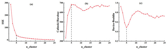 Determining the optimal K-value based on various metrics. (a) SSE; (b) Calinski–Harabaz; (c) Davies–Bouldin.