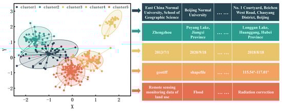 Based on Matplotlib, the clustering results were plotted as shown in Figure 9. In the flood dataset, the 359 extracted metadata information items were divided into five clusters. With a confidence level of 90% for the centroids, the majority of the information was covered. According to Figure 9, each cluster contained metadata information that categorized the flood dataset into five main themes: Cluster 1 represents contact information, cluster 2 represents location information, cluster 3 represents time information, cluster 4 represents format information, and cluster 5 represents content information.