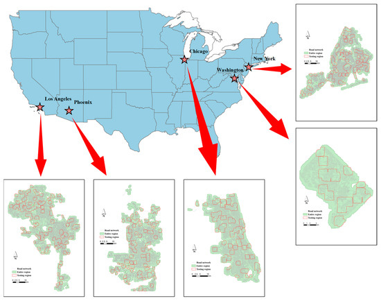 We collected road networks and geospatial data from five cities in the United States: Chicago, Los Angeles, New York, Phoenix, and Washington (Figure 3). The statistics presented in Tables S1–S3 illustrate the differences in road networks and geospatial context data among these cities. These five cities were selected for two reasons. First, they represent diverse road network patterns. New York, Chicago, and Washington have relatively more regular streets, whereas the streets of Los Angeles and Phoenix show more irregular patterns. Second, the five cities differ in their geographical conditions. New York and Los Angeles are coastal cities, Chicago is located near a large lake (Lake Michigan), Washington has rivers running through its downtown area, and Phoenix is an inland and mountainous city. This geographical diversity ensures that the findings from this research can be generalized to a broader range of settings, enhancing the relevance and practical applications of the results.