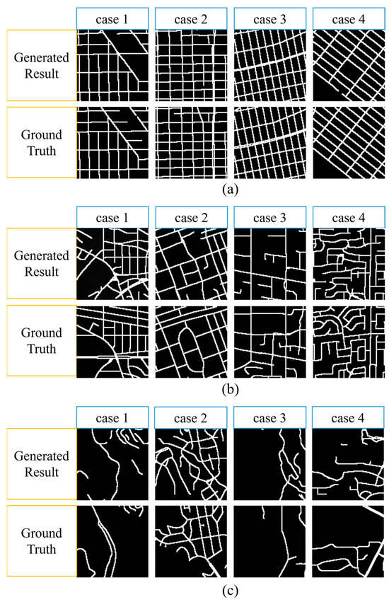 Following previous research [52,53], we roughly classified the road networks into three patterns: regular, irregular, and suburban. The regular pattern is mainly composed of grid-like streets. The irregular pattern includes both main and side roads and has a more complex road network layout. The suburban pattern is located in the suburban regions of cities; it is characterized by a relatively small road density and the presence of curved road lines. Figure 5 shows several examples of generated road networks of each pattern in the testing set. The generated results of regular patterns were the most similar to the real road networks. Our model successfully recovered the road layouts and the majority of road segments in the four cases, except for some minor roads in cases 1 and 4. For the irregular pattern, our model can capture the overall shape of road networks, but the result is less accurate for short and side roads. The discrepancy between our generated results and the ground truth was the largest in suburban regions. A possible reason for this is that there are fewer road intersections in suburban regions, giving our model more freedom to generate road images. Another reason is that curved road courses are harder to predict compared with straight lines, as our training datasets in the five cities contain more straight roads than curved roads.