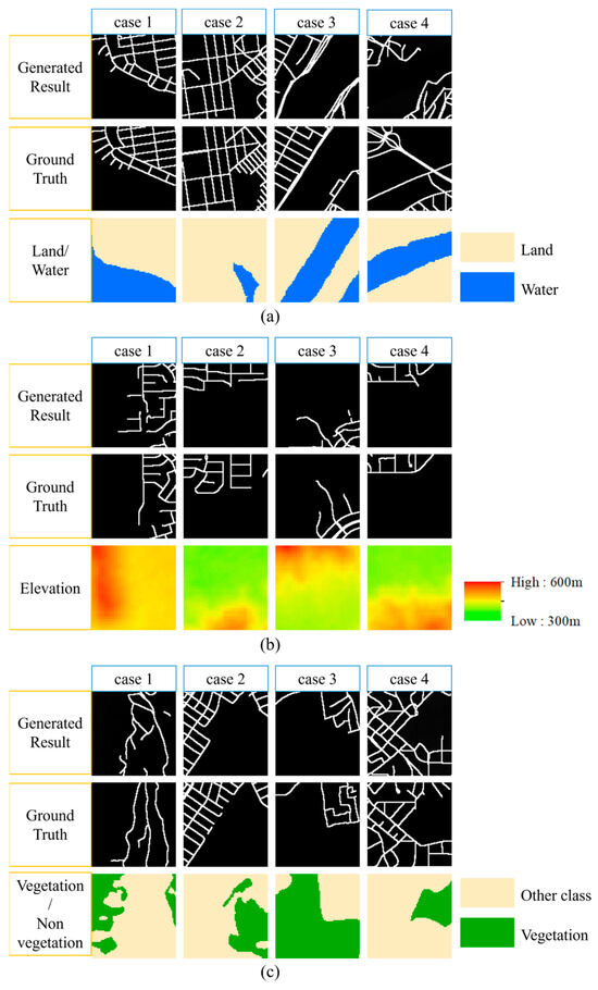 The forms and topologies of road networks are constrained by natural obstacles, including water, mountains, and vegetation [54,55,56]. Herein, vegetation refers specifically to tall dense trees, which are represented with a pixel value of 2 in the land use data. We first present several samples in Figure 6 to examine the obstructive effects of the three types of obstacles on road network generation. In Figure 6a, land and water are painted yellow and blue, respectively. It can be found that water significantly restricts the expansion of roads. Compared with cases 3 and 4, cases 1 and 2 show better results in recovering the spatial distribution of roads, which should be due to their regular street forms and larger number of intersections. It is worth noting that our model does not seem to be effective at predicting the bridge in case 4. The existence of water in the middle prevents the bridge line from expanding across the two sides. Figure 6b shows the cases near mountains. In all four cases, the roads generated by our model were mainly located in gently sloping areas, consistent with the real situation. This suggests that mountains are also an obvious obstacle to road expansion in our model. Figure 6c illustrates the cases containing vegetation. Similar to the above two obstacles, the existence of vegetation patches presents obvious obstruction to urban roads.