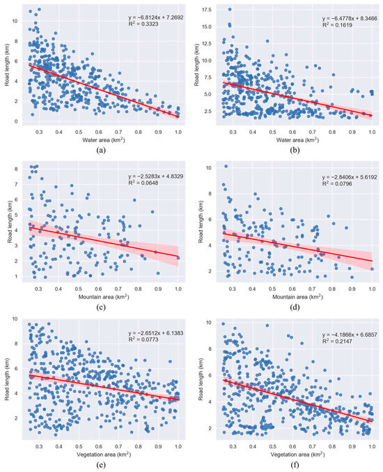 Next, we focused on individual road network patches within the testing regions that contain water, mountains, or vegetation. We considered each of these patches as an observation and built linear regression models for four different scenarios based on these observations (Figure 7). In these models, the dependent variable is the sum of road length in a given patch, and the explanatory variables are the areas of water, mountains, or vegetation in that patch. To calculate the water area, we utilized land use data to extract water pixels and then summed their individual areas. The vegetation area was also calculated using this method. For the sake of simplicity, the extraction of mountains was performed on DEMs using the mathematical morphological algorithm described in [57].