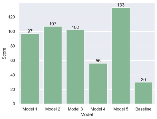 To assess the visual and geometric similarity between the generated results and ground truths, we evaluated both the generated images and road networks in the testing set. The evaluation results are summarized in Table 3. We assigned scores to each model based on their rankings in each row of Table 3. The scoring rule awards points from 6 to 1 to models ranked 1 to 6. By summing the scores across all 25 rows, we obtained the final score for each model. As Figure 8 demonstrates, Model 5 achieved the highest score among all models, indicating its superior performance in predicting road networks for the five cities. Furthermore, all our five models outperformed the baseline, confirming that geospatial factors contribute to the formation of realistic street layouts, which aligns with previous research findings [12,13].
