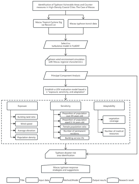 The present study aims to fill these gaps. Firstly, given that existing research ignored the impact of vulnerability assessment in high-density urban areas, we focus on identifying typhoon disasters and exploring adaptation strategies in high-density regions. This study conducts a spatiotemporal quantitative analysis of all typhoons that affected Macau from 2000 to 2020, investigating the spatial distribution and seasonal characteristics of typhoon disasters and revealing the main tracks of these typhoons. Moreover, line density analysis and seasonal variations are performed through GIS spatial statistics. Secondly, since 3D data can offer more details and precision than 2D data, the typhoon wind environment in Macau is numerically simulated at a 3D scale, considering the main characteristics and features of Macau’s topographical surface. Thirdly, we developed an urban disaster vulnerability (UDV) assessment model using the ‘exposure–sensitivity–adaptation’ framework. This model aims to construct an urban disaster vulnerability assessment framework specifically for typhoon vulnerability, and a corresponding index system is established to systematically assess and quantify the vulnerability to typhoon disasters in cities. The model assesses the entire city of Macau on a grid scale to identify areas vulnerable to typhoon disasters. In addition, principal component analysis (PCA) reveals the significant factors influencing the areas prone to typhoons in Macau.