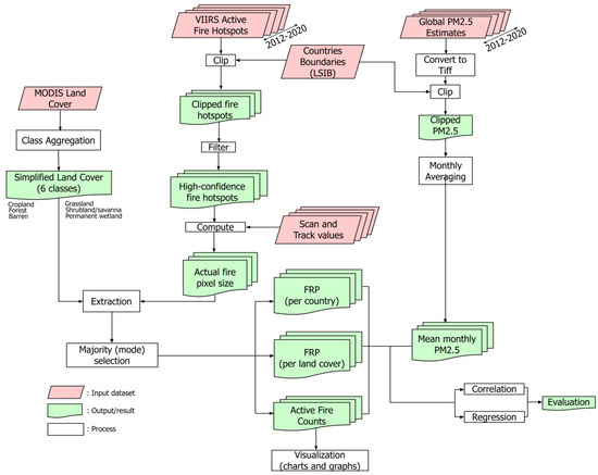 Figure 2 shows the workflow of the study. The distribution of VIIRS active fire counts and FRP were investigated, both temporally and spatially. Furthermore, the correlations between the VIIRS monthly active fire counts, cumulative monthly FRP, and mean monthly PM2.5 estimates were studied per country and land cover type to detect potential patterns. We used publicly available geospatial datasets to enable the repetition of the methodology in future studies [39]. Due to the large spatial scale of the datasets required, Google Earth Engine (GEE) [40] was used for the preprocessing and analysis of the data. GEE is a cloud-based visualization and analysis platform that provides access to a variety of satellite imagery and geospatial datasets at a global scale. The VIIRS active fire data were loaded in GEE and clipped to the boundaries of the Lower Mekong countries. The Large Scale International Boundaries (LSIB) dataset created by the U.S. Department of State in 2017 (https://developers.google.com/earth-engine/datasets/catalog/USDOS_LSIB_SIMPLE_2017 (accessed on 14 June 2024)) was used for that purpose. The VIIRS fires were filtered to a “high” confidence level to only include fires with high confidence values. For each fire hotspot center detected, the actual fire pixel size was computed using the scan and track values associated with each hotspot [24]. More specifically, geometric calculations are used, based on the resolution of the satellite images and the dimensions represented by the scan and track values, which are converted into actual distances on the ground. The MODIS dataset was used to extract land cover for each VIIRS fire pixel. The MODIS land cover classes were merged to have a simplified set of classes including cropland (classes 12 and 14), forest (1, 2, 3, 4, and 5), barren (16), grassland (10), shrubland/savanna (6, 7, 8, and 9), and water/permanent wetlands (11 and 17). The majority (mode) pixel value within the fire pixel was selected as the raster value for the specific VIIRS fire in order to incorporate the contextual information within each fire pixel. This was conducted using the GEE reduce region function. This process was repeated for the 2012–2020 time period. The resulting feature collections were then exported into R, the programming language that was used to create graphs (line charts and bar) using automated scripts and the ggplot2 library. The fires detected using the MODIS land cover classes mentioned above were then used to study the existing correlation with PM2.5 estimates. The monthly PM2.5 data were converted to the GeoTIFF file format and clipped to the boundary of the study area. The mean monthly PM2.5 value was calculated for each Lower Mekong country. Mean values were compared with the monthly values of detected fire counts and with the cumulative values of monthly FRP. This was conducted per country and per land cover, spanning the years 2012–2020 through scatterplots. To develop a better understanding of the relationship between monthly fire counts, FRP, and PM2.5 concentrations, the Pearson correlation [41] and the coefficient of determination (R2) were computed. Finally, we calculated the Maximal Information Coefficient (MIC) as a non-linear correlation matrix to test the degree of non-linearity of our results.