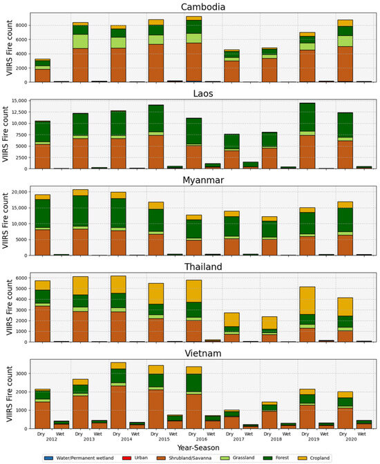 Proportions of seasonal VIIRS active fire counts per simplified MODIS land cover class and country for 2012–2020.