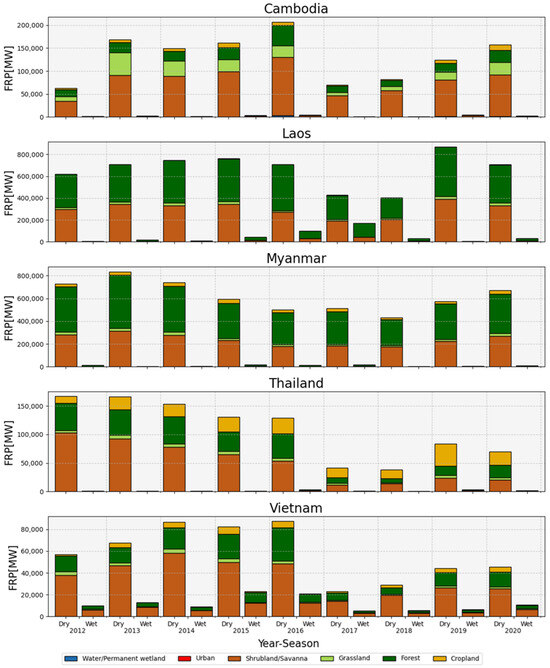 The cumulative annual FRP per land cover (as indicated in Figure 7 and Table 3 and Table 4) follows a similar trend as the fire count. Especially the fires detected in the shrubland/savanna and forest classes contribute majorly to the annual total FRP. Fires detected in the cropland class contribute less to the annual FRP, indicating that the FRP of cropland fires appears to be smaller than the FRP of forest or shrubland/savanna fires. The distribution of FRP by land cover in each country shows a pattern similar to that of the fire counts. For forests, Myanmar exhibits the highest percentage, while Vietnam shows the greatest portion in shrubland/savanna, Cambodia in grassland, and Thailand in cropland. However, the share of FRP by land cover changes slightly in each country. In most nations, the percentages for grassland and cropland decrease, with an increase observed in the share of forest. This trend is most pronounced in Myanmar and Laos, with increases of 9.61% and 9.00%, respectively. In Thailand, the proportion of cropland significantly drops by 13.09%, while the share of shrubland/savanna markedly increases by 8.46%.