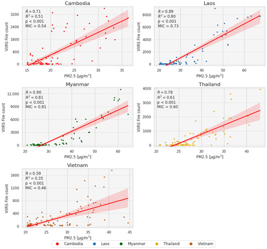 The correlations between mean monthly PM2.5 concentrations at the country level and VIIRS fire counts are visualized in Figure 8. The monthly data suggest a statistically significant linear correlation between VIIRS fire counts and mean PM2.5 concentrations for all countries (). Myanmar displays the highest positive correlation () and coefficient of determination (), followed by Laos and Thailand.