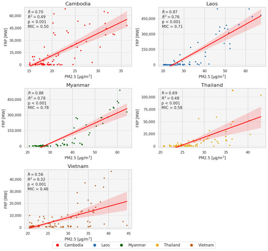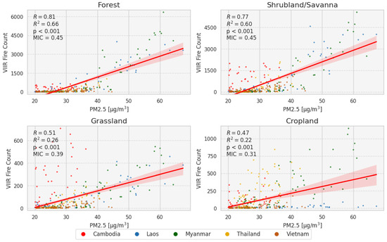 Figure 11 displays the correlation between monthly cumulative FRP and mean PM2.5 estimates per land cover. Similar correlations were observed compared to the monthly fire count (Figure 9), where the FRP of fires detected in forest, shrubland/savanna, cropland, and grassland classes display a significant positive correlation (p < 0.05). Overall, for all land covers, Cambodia displays the lowest cumulative monthly FRP. The cumulative results in Figure 10 and Figure 11 have an MIC range between 0.34 and 0.78, which, in combination with the R and p values reported in the same results, indicate a linear relationship between the dependent and the independent variables.
