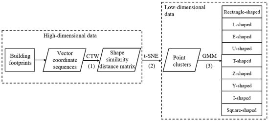 The methodology for building footprint recognition is illustrated in Figure 1, encompassing three main stages: (1) Transformation of shapes into vector coordinate sequences, followed by a computation of the similarity distances between these sequences using the CTW algorithm. (2) Integration of the t-SNE algorithm to incorporate shape similarity distances as the matrix among high-dimensional data. After dimensionality reduction, vector representations of building footprints (in high dimension) are projected onto multiple point clusters (in low dimension), each cluster representing a distinct shape type. (3) Utilization of the GMM algorithm to evaluate recognition accuracy based on the inherent clustering patterns of points and actual building footprints. The shape recognition result is determined by the clustering category assigned to each building footprint.