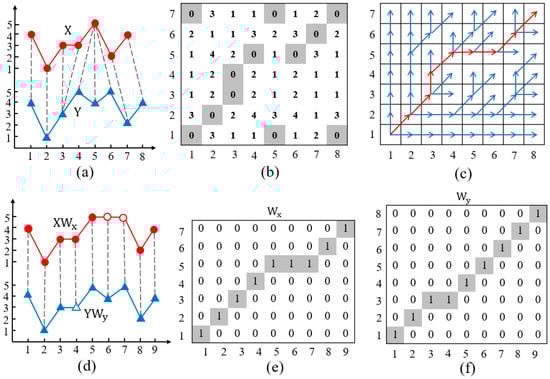 An example DTW for aligning two series. (a) Two series (m = 7 and n = 8) and the optimal alignment between samples computed by DTW. (b) Euclidean distances between X and Y. (c) DP policy at each pair of samples, where the red curve donates the optimal warping path (K = 9). (d) A matrix-form interpretation of DTW as stretching the two sequences in matrix products. (e) Warping matrix . (f) Warping matrix .