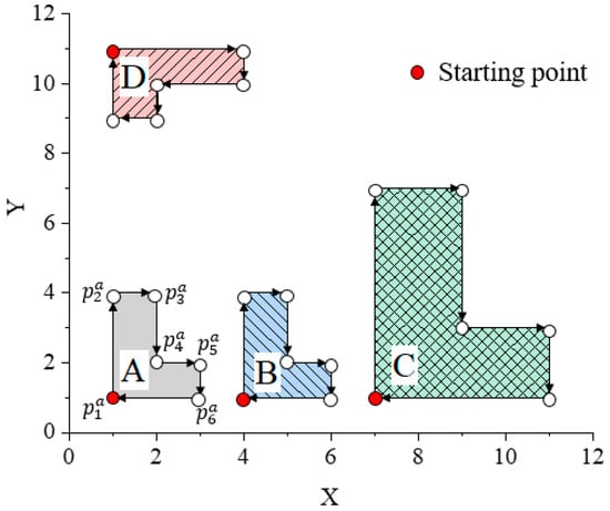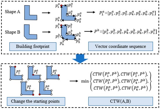 (2) Select different vertices in A as the starting point and generate a set of sequences in the clockwise direction, which are represented as . where is the coordinate sequence that starts at the vertex in A. Subsequently, the canonical warping distance between the sequences in and , denoted as the minimum, serves as the ultimate distance between A and B, as depicted by Equation (7).