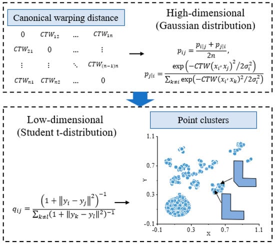 As shown in Equation (12), the t-SNE method employs a gradient-based technique to minimize the Kullback–Leibler divergence between and . The gradient descent method is shown in Equation (13), where is the solution at iteration , indicates the learning rate, and (t) represents the momentum factor at iteration .
