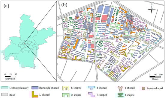 The experimental dataset was sourced from vector buildings at a scale of 1:10,000 in Wuhan, China, as depicted in Figure 6. This dataset comprised 742 building polygons. The residential buildings within the study area exhibited typical characteristics common to urban structures. Nine template shapes were manually created based on this dataset, including rectangular, L-shaped, E-shaped, U-shaped, T-shaped, Z-shaped, Y-shaped, I-shaped, and square-shaped buildings. As outlined in Table 2, the highest number of buildings in the study area were rectangular, followed by square-shaped buildings, while the lowest counts were observed for Y-shaped buildings, with E-shaped buildings following closely behind.