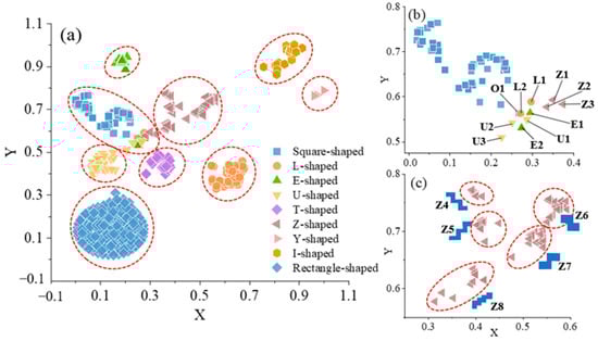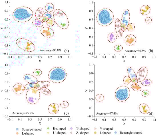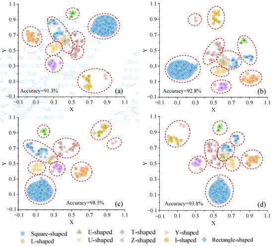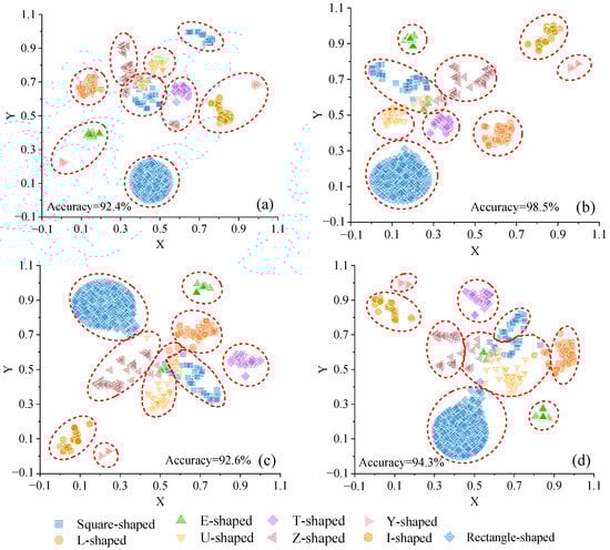It is important to note that the distance between different clusters in two-dimensional space does not necessarily reflect the similarity between different types of shapes. For instance, in Figure 7a, the clusters of U-shaped and square-shaped points appear closer together; however, this proximity does not imply a higher similarity between U-shaped and square-shaped buildings. Upon running the t-SNE algorithm multiple times based on the same experimental data, different distribution patterns of point clusters may emerge. Sometimes, U-shaped and square-shaped clusters are relatively distant from each other, while at other times, they may be closer.