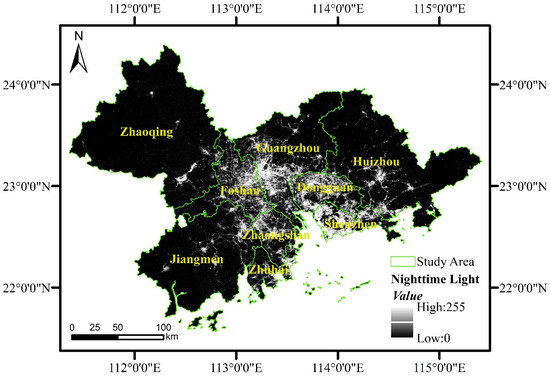 The NPP/VIIRS NTL data are obtained through observations by the Visible Infrared Imaging Radiometer Suite (VIIRS) on the Suomi National Polar-orbiting Partnership (NPP) satellite, operated by the National Aeronautics and Space Administration (NASA). First, the EOG website is accessed, and the appropriate product (e.g., monthly or annual composite data) is selected to download the required data files in HDF5 or GeoTIFF format. During the processing phase, geographic information system (GIS) software or programming languages (such as the GDAL and Rasterio libraries in Python) are used to unzip and read the data. Next, radiometric correction is performed, and clouds, fires, and other anomalously bright spots are removed. Subsequently, projection transformation, resampling, and standardization is conducted to ensure the data align with other geographic data sources. Finally, brightness thresholding and spatial analysis is applied to identify the boundaries of urban agglomerations. As a widely used source of NTL data, NPP/VIIRS offers superior spatial resolution and temporal series, presenting distinct advantages over other NTL datasets [38]. In this study, we access the 2022 NPP/VIIRS NTL data for the PRD urban agglomeration from the NASA Earth Observing System Data and Information System (EOSDIS) website. The acquired data undergo preprocessing, including cloud removal, radiance calibration, and image contrast adjustment, resulting in the preprocessed NTL data visualization of the PRD urban agglomeration, as shown in Figure 1.