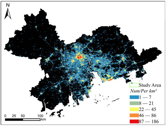 Social media data are sourced from the Sina Weibo platform, which, along with Zhihu, Toutiao, and Baidu Tieba, constitutes the landscape of social media in China. Sina Weibo, launched in 2009, stands as China’s first mainstream social media platform. By the end of 2022, it maintained a stable active user base of 586 million, ranking it at the forefront of mainstream social media in China. Weibo sign-in data refer to the information generated by users’ sign-in activities on Sina Weibo, documenting the specific locations and related details of user sign-ins. Compared to data from other social platforms, Sina Weibo sign-in data are characterized by their real-time nature and spatiotemporal attributes, capturing the timing and geographical location information of user sign-ins at various places [39]. In this study, we access the Sina Weibo open platform to acquire Weibo sign-in data for the year 2022, totaling approximately 10.34 million entries. The data attributes include geographical coordinates (latitude and longitude), sign-in locations, Weibo links, blogger homepage links, text content, links to images and videos, posting time, number of shares, comments, likes, and follower counts. Given the presence of erroneous or invalid sign-in entries within the acquired data, we process the data through cleaning, geocoding, and spatial clustering, among other methods. First, the Weibo API interface (e.g., the location service API) is used to collect sign-in data, including user IDs, sign-in times, sign-in locations, and other relevant information. After obtaining the data, data cleaning is performed, which includes removing duplicate sign-in records to ensure each record is unique; handling missing values by either deleting records with significant missing data or using interpolation methods to fill gaps; and standardizing the sign-in time format, such as converting it to a standard time format. The cleaned data can then undergo further processing, including converting geographic coordinates to the required coordinate system to ensure alignment with other geographic data sources. Consequently, we obtain the spatial distribution of Sina Weibo sign-in data for the PRD urban agglomeration as shown in Figure 2, with sign-in frequencies aggregated into 1 km grid squares.
