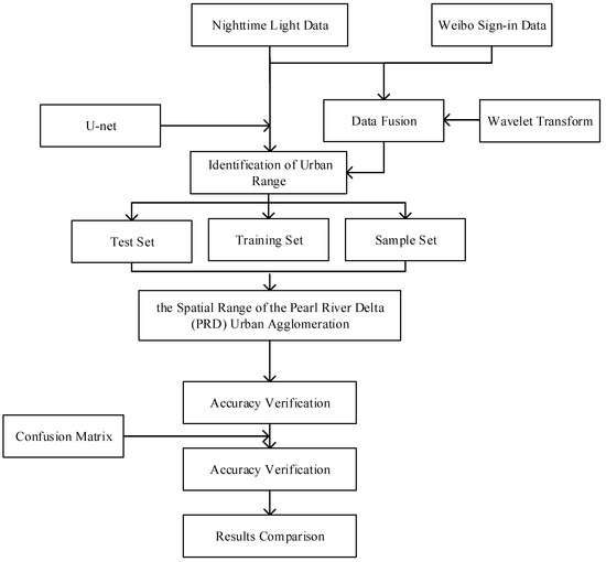 This study, premised on the spatial differences within urban agglomerations, employs a fusion of Weibo data and NTL data, utilizing the U-net neural network to identify the spatial range and distribution characteristics of the PRD urban agglomeration. Furthermore, a comparative analysis is conducted between the urban agglomeration ranges identified after data fusion and those identified using solely NTL data.